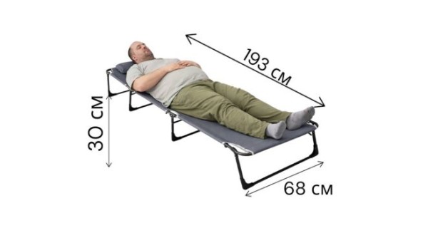 Характеристики: Тип: складана розкладачка/шезлонг Тканина: щільна, зносостійка, вологостійка (оксфорд 1200D) Максимальне навантаження: до 200 кг Каркас: металевий, посилений Кількість ніжок: 4 Розмір: 193×68×30 см