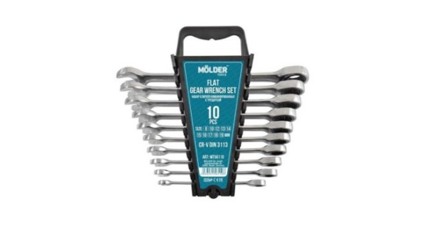 Molder MT56110 — це набір із 10 комбінованих гайкових ключів із тріскачками, які застосовуються під час виконання слюсарно-монтажних робіт із нарізними з'єднаннями, що мають зовнішній профіль. Сфера застосування цього набору дуже широка: автосервіси, станції техобслуговування, виробництво, майстерні за ремонтом й обслуговуванням техніки та навіть побутова сфера. Достатно широкий розмірний діапазон ключів від 8 до 19 мм охоплює основні завдання з нарізними з'єднаннями під час ремонту легкового автомобіля. Наявність у конструкції ключів ріжкового та накидного головок однакового розміру дає змогу користувачеві підбирати найзручнішу головку залежно від складності та місця розташування нарізного з'єднання.