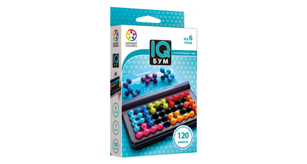 Настільна гра ТМ Smart Games IQ Бум – це головоломка з 3D деталями, які треба розташувати у 2D просторі. Вона містить в наборі 120 завдань, в яких деякі деталі розміщені від початку, а решту потрібно розташувати самостійно так, щоб вони ідеально доповнили картинку. Правильне рішення знайдено, коли всі деталі головоломки помістилися на ігровому полі і не залишилося жодного отвору.