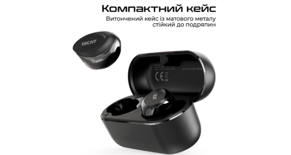 • Bluetooth 5.2: з функцією динамічної оптимізації потужності, зменшує енергоспоживання й робить сигнал ще більш стабільним. • Відмінний звук: сучасний чіп Bluetooth у парі з якісними динамічними випромінювачами, забезпечують глибоке та збалансоване звучання на всьому діапазоні частот. • Шумозаглушення ENC: фірмова технологія CVC 8.0 від Qualcomm гарантує кришталево чисту якість передачі голосу без зайвих перешкод. • 20 год. автономної роботи: Yacht будуть програвати музику 5 год., а за допомогою кейса ви зможете їх підзарядити до 3 разів. • Ергономічний дизайн: легкі вакуумні навушники анатомічно правильної форми. Вони зручно лежать у вусі та не викликають дискомфорту навіть після тривалого використання. • Функція швидкого заряджання: просто покладіть навушники на 15 хв. у кейс і насолоджуйтесь музикою цілу годину. Сам кейс заряджається через USB-C порт за 1,5 год. • Компактний кейс-акумулятор: витончений кейс із матового металу, стійкий до подряпин та надійно захищає твої навушники. • Захист за стандартом IPX5: завдяки спеціальній конструкції Yacht захищені від бризок, дощу, пилу та піску, а тому ідеально підходять для використання в будь-яку погоду. Повністю занурювати у воду не рекомендується. • 1 або 2: навушники повністю автономні, ви можете використовувати один з них як гарнітуру, поклавши інший в кейс, без додаткових налаштувань. • IntelliTouch управління: сенсорні кнопки дозволяють відповідати на дзвінки, ставити музику на паузу, регулювати гучність, перемикати треки та викликати голосового помічника. • Широка сумісність: ґаджет повністю сумісний з усіма пристроями з підтримкою Bluetooth будь-яких версій.