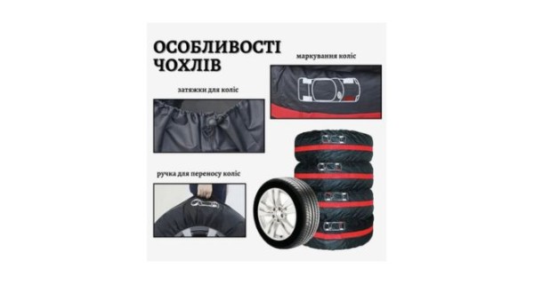 Особливості: • Розмір: L (підходить для коліс R17–20) • Кількість у наборі: 4 чохли • Матеріал: зносостійкий поліестер, стійкий до механічних пошкоджень • Захист: захищають шини від ультрафіолетового випромінювання, бруду та пилу • Зручність: прості у використанні завдяки міцним ручкам для транспортування • Маркування: дозволяє швидко знайти потрібне колесо чи шину