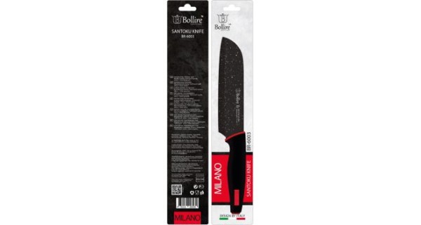 Довжина леза: 18 см. Високоякісна нержавіюча сталь 3CR14. Загартована різальна крайка. Цілісний клинок. Лазерний візерунок. Ручка з натурального чорного дерева. Картонне пакування з віконцем і отвором для підвішування. Альтернатива ножа шеф-кухаря завдяки висоті клинка та легкості ручки. Завдяки наявності повітряних капсул продукти не прилипають до різальної поверхні, тому нарізати можна легко та швидко. Основне призначення такого ножа: різати, рубати та кришити.