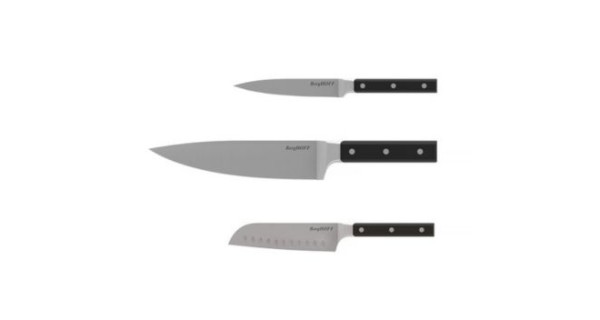 Особливості: ідеальний стартовий набір ножів: кухарський ніж та ніж сантоку підходять для нарізування кубиками, а універсальний – для дрібного нарізування; кована нержавіюча сталь тривалий час зберігає гостре заточування; кріплення до рукояток за допомогою трьох заклепок; підходять як для професійного, так і для домашнього використання; ергономічні, безпечні ручки; легко очищаються. Догляд: рекомендується ручне миття.