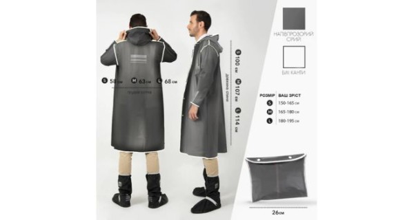 Розмірний ряд: Дощовик підходить для людей різного зросту — від 150 до 190 см. Розмір L — 175-190 см. Чохол має розміри 26 см.