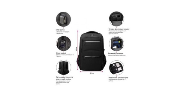 Основні переваги: • Місткість і багатофункціональність • Відділення для ноутбука до 17 дюймів • Чотири фронтальні кишені на блискавках для зручної організації речей • USB-роз’єм і гніздо для навушників • Дві бічні кишені для пляшок або парасоль • Міцні регульовані лямки та еластичний ремінь для валізи • Щільний водонепроникний поліестер