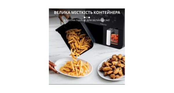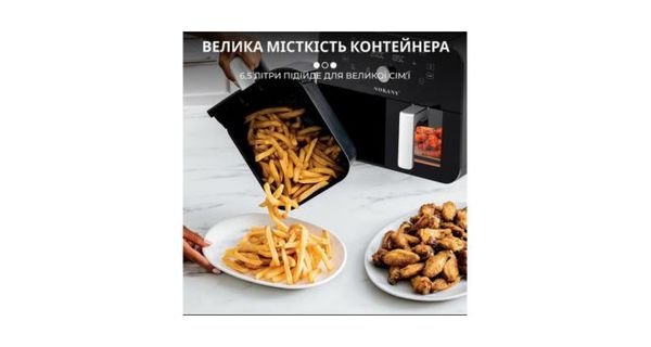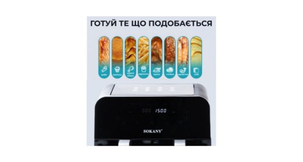 Переваги аерогриля SOKANY: • Потужність 2400 Вт. Висока потужність аерофритюрниці забезпечує швидке нагрівання і рівномірне приготування різних страв. • Регулятор температури. Аерофритюрниця оснащена регулятором температури, що дає змогу вибрати оптимальний режим приготування. Це дозволяє готувати різноманітні страви — від хрустких овочів до соковитого м’яса. • Таймер. Вбудований таймер дає змогу встановити час приготування до 60 хвилин, після чого аерофритюрниця автоматично вимкнеться, забезпечуючи безпеку та запобігаючи пересушуванню або пересмажуванню страв. • Два відділення по 5 л дають змогу одночасно готувати різні страви. Просторий об’єм аерофритюрниці дозволяє готувати великі порції їжі для всієї родини або гостей. • Приготування без олії за допомогою циркуляції повітря. Інноваційна технологія аерофритюрниці дає змогу готувати страви без олії завдяки циркуляції гарячого повітря всередині камери приготування. Це сприяє отриманню здорової та хрусткої текстури страв. • Сенсорне керування. Аерофритюрниця оснащена сенсорним керуванням, що робить налаштування режимів готування простим і зручним.