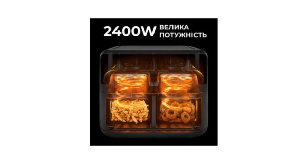 Характеристики: Тип: електрична аерофритюрниця Ємність: 10 л Потужність: 2400 Вт (2×1200 Вт) Номінальна напруга: 220–240 В Матеріал корпусу: пластик Керування: сенсорне Таймер: є Особливості: 2 відділення по 5 л