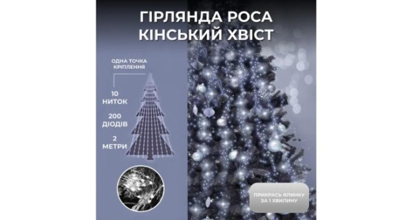 Гірлянда «Кінський хвіст» 200 LED, 10 ниток, 2 м — забезпечує яскраве та тривале світіння для прикрашання інтер’єрів і екстер’єрів. Поєднує зручну довжину, елегантний дизайн та енергоефективні LED-лампи, що робить її чудовим вибором для створення святкової атмосфери.