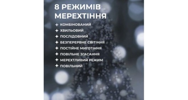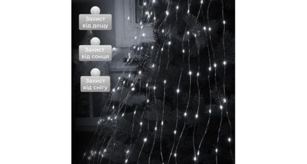 Характеристики: Тип живлення: від мережі Колір світіння: білий Тип освітлення: світлодіодна гірлянда Режим роботи: динамічний Кількість світлодіодів: 200 Довжина: 2 м Кількість режимів світіння: 8