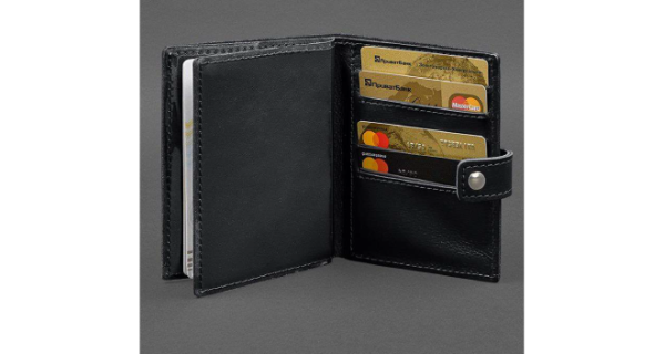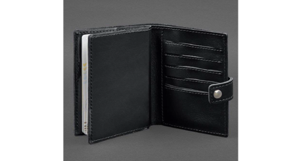 Всередині є 1 відділення для купюр, 5 слотів для пластикових карт, одна прозора кишеня та відділення для документа. Закривається портмоне-обкладинка хлястиком з кнопкою.