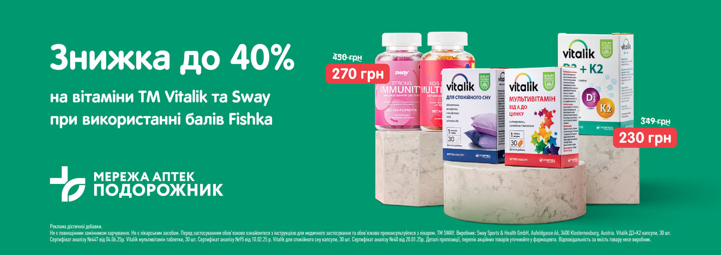 Обирайте необхідний вітамінний комплекс від ТМ Vitalik та Sway зі знижкою до 40% за умови списання балів Fishka при купівлі вітамінів: