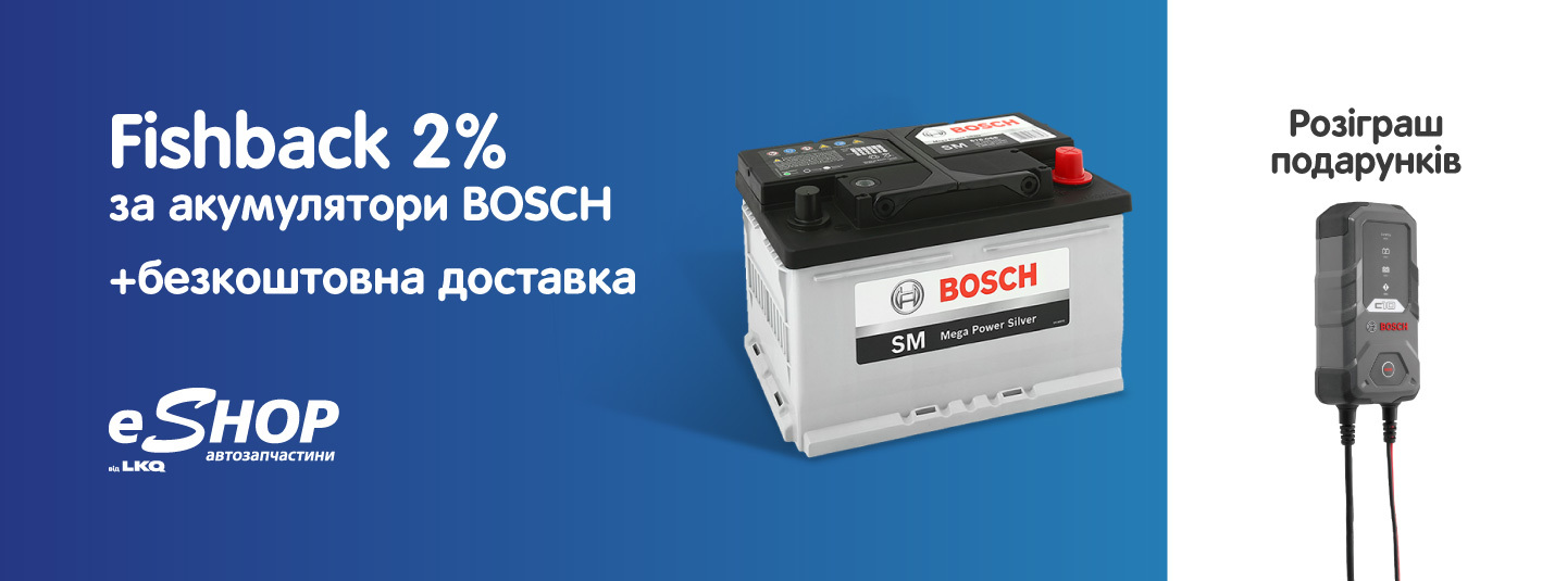 Купуйте акумулятори ТМ BOSCH в інтернет-магазині eShop або в роздрібній мережі "Еліт-Україна" , отримуйте Fishback 2% балами та безкоштовну доставку у відділення "Нова Пошта".