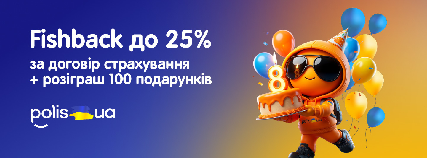 Оформляйте договори страхування на Polis.ua та беріть участь у розіграші 100 подарунків від Polis.ua та партнерів, а з промокодом FISHKA2026 отримуйте ще й Fishback до 25%.