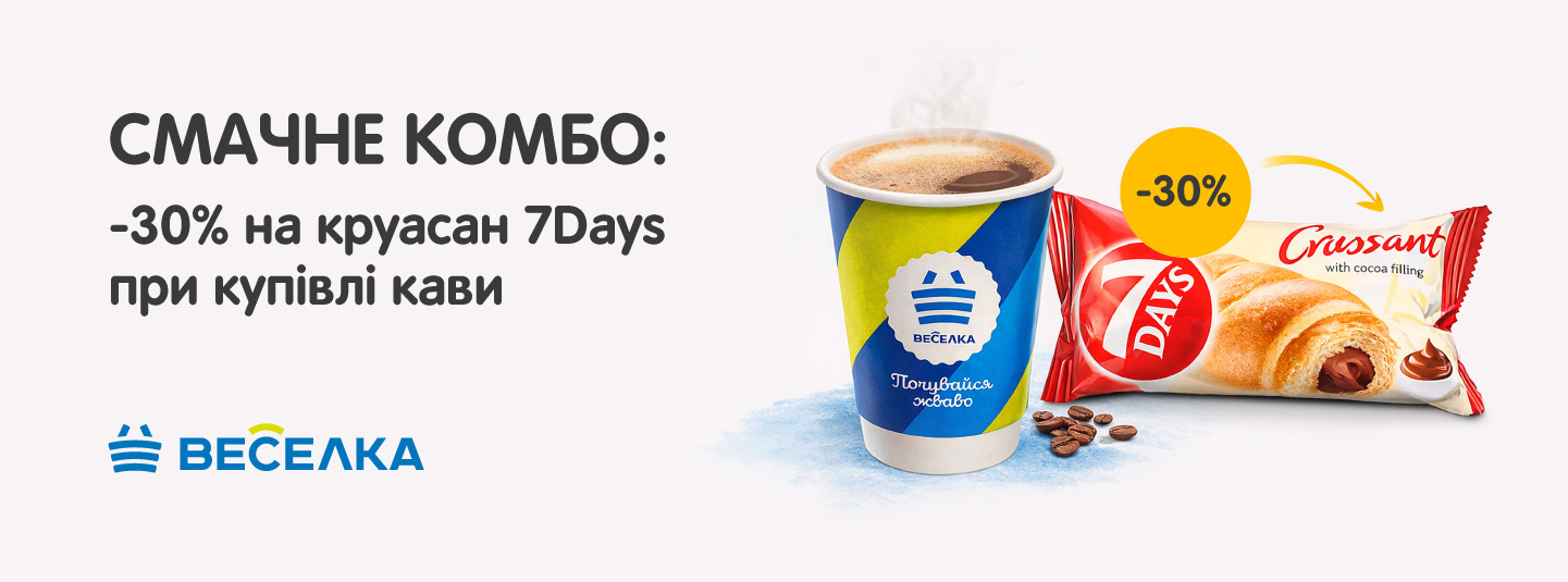 Не проґавте смачне комбо в маркетах "Веселка": кава + круасан 7 Days зі знижкою 30%.