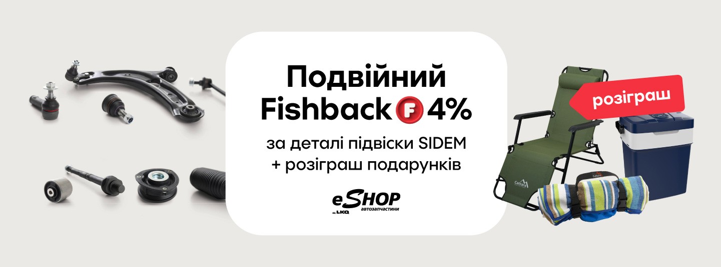 Оновлюй підвіску авто з деталями ТМ SIDEM в інтернет-магазині eShop від LKQ або у філіях – і отримуй подвійний Fishback 4% балами Fishka на свій рахунок.