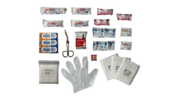 Перелік вкладень: Бинт нестерильний (7м х 14см) 1шт Бинт стерильний (5м х 10см) 3шт Бинт нестерильний (5м х 5см) 3шт Косинка медична перев'язувальна ( 136см х 96см х 96см ) 1шт Серветка медична антимікробна з фурагіном 10 х 13 см 1шт Серветка медична з хлоргексидином ( 6 х 10 см ) 1шт Лейкопластир котушковий (1см х 5м) 1шт Лейкопластир бактерицидний (1,9см х 7,2см) 3шт Антисептичні та дезінфікуючи засоби для обробки шкіри Серветка для обробки ран №1 (45см х 29см) 2шт Серветка для обробки ран стерильна 2 шт в компл.(10см х 10см) 3шт Набір №2