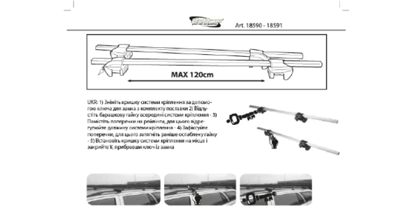 Багажна система, яка виготовлена зі сталі, монтується на будь-які стандартні рейлінги з просвітом. Швидко й легко кріпиться, що дозволяє за необхідності перемістити поперечини в потрібний бік, змінюючи відстань між ними. Профіль прямокутний, довжина кріплення становить 120 см. Максимальне навантаження - 50 кг. Фіксується за допомогою ключа. Підходить для встановлення додаткових фіксаторів для перевезення спортивного інвентарю, вантажних боксів та інших вантажів. Багажник універсальний та сумісний з більшістю марок автомобілів. У комплекті йде все необхідне для установки на авто.