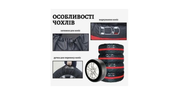 Особливості: • Розмір: M (підходить для коліс R14–17) • Комплектація: 4 чохли в наборі • Матеріал: зносостійкий поліестер, стійкий до пошкоджень • Захист: ефективно захищають шини від ультрафіолету та забруднень • Зручність: міцні ручки для легкого транспортування • Маркування: допомагає швидко знайти потрібне колесо чи шину