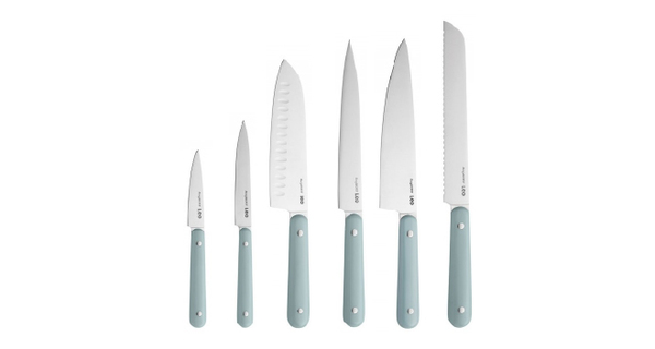 Комплектація: • 1 х кухарський ніж, 20 см • 1 х ніж для хліба, 20 см • 1 х ніж обробний, 20 см • 1 х ніж Сантоку, 17,5 см • 1 х ніж універсальний, 12 см • 1 х ніж для овочів, 9 см • 1 х колода для зберігання ножів