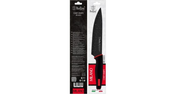 Ніж шеф-кухаря Bollire Milano, довжина 20 см. Кухонні ножі серії Milano виконані з високолегованої сталі, створеної азіатськими технологами, яким вдалося отримати матеріал із відмінними експлуатаційними характеристиками: Міцність, твердість, стійкість до зносу. Завдяки покриттю Graphite non-stick coating продукти не прилипають до леза при нарізуванні, а сталь максимально захищена від пошкоджень. Леза мають двостороннє симетричне заточування по всій довжині ріжучої кромки, що забезпечує легку нарізку та обробку. Ергономічна рукоятка забезпечує комфорт у процесі нарізки, стійка до ковзання та забезпечує безпечну роботу. Ручка із натурального чорного дерева. Картонна упаковка з віконцем та отвором для підвішування. Основне призначення такого ножа: кришити, різати та обробляти.